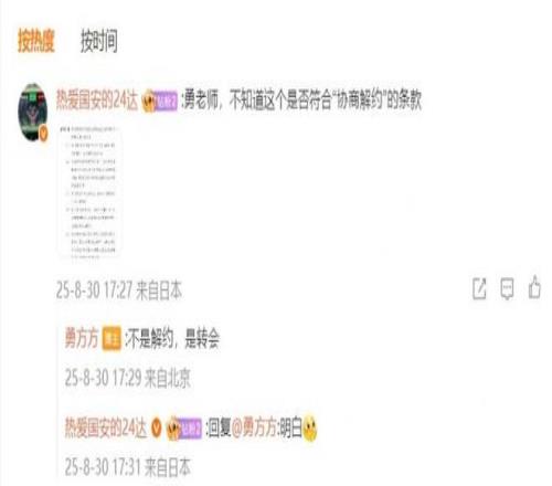 有網(wǎng)友提到了“協(xié)商解約”的條款,@勇方方 回復(fù):“不是解約,是轉(zhuǎn)會(huì)?!?/p>