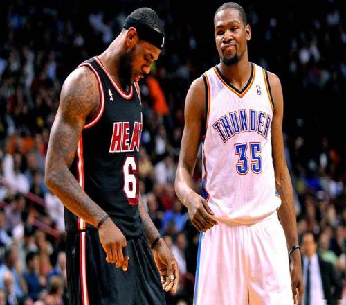 職業(yè)生涯中,他們都曾是“超級(jí)球隊(duì)”的領(lǐng)軍人物:詹姆斯在騎士和熱火,杜蘭特在勇士、籃網(wǎng),以及(曾試圖組建超級(jí)球隊(duì)的)太陽。但如今,兩人首次面臨同一個(gè)更強(qiáng)的對(duì)手——俄克拉荷馬城雷霆。
