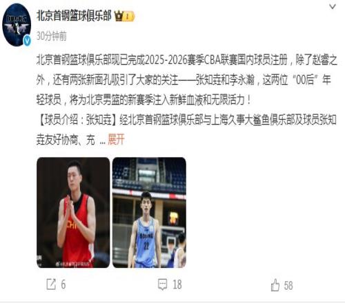 根據(jù)CBA官網(wǎng)公布的注冊(cè)情況,北京男籃目前已經(jīng)注冊(cè)了16位國(guó)內(nèi)球員,北京男籃官方公告也是寫(xiě)道:“北京首鋼籃球俱樂(lè)部現(xiàn)已完成2025-2026賽季CBA聯(lián)賽國(guó)內(nèi)球員注冊(cè),除了趙睿之外,還有兩張新面孔吸引了大家的關(guān)注——張知垚和李永瀚,這兩位‘00后’年輕球員,將為北京男籃的新賽季注入新鮮血液和無(wú)限活力!”