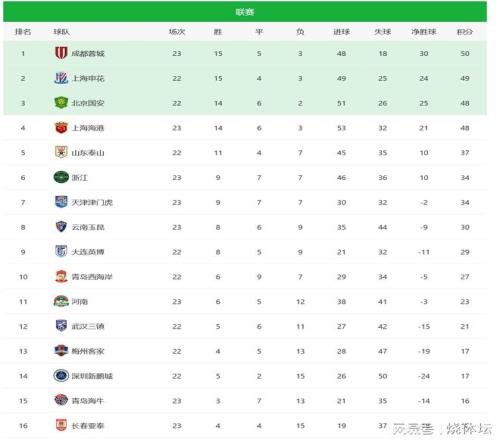 中超積分榜:成都蓉城大勝暫時(shí)領(lǐng)跑,云南玉昆絕平亞泰穩(wěn)住前十